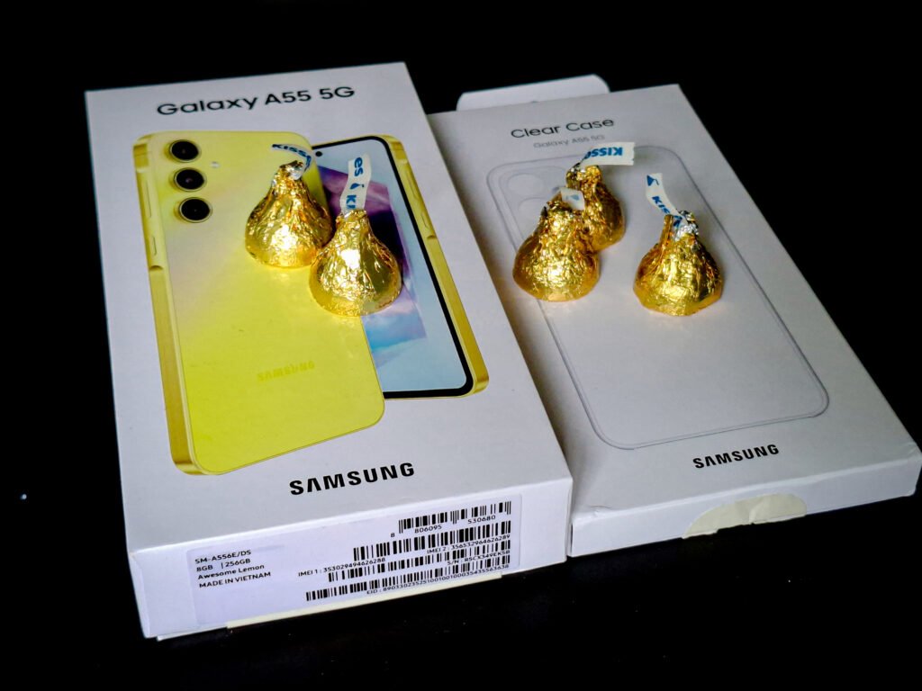 It was a weekend I’d been waiting for — the day my new Samsung Galaxy A55 finally arrived. The excitement was real, but I decided to take it up a notch. Before slicing through the tape, I grabbed a handful of Hershey’s Kisses Milk Chocolates, poured them into a small bowl, and set them right beside the box.